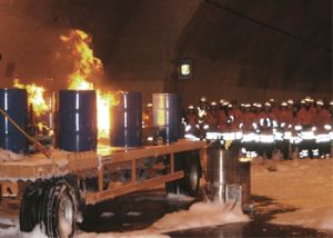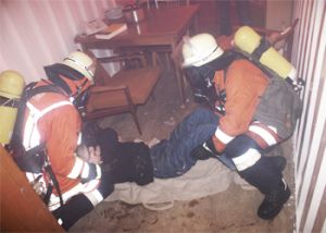 The rooms, halls or underground garages are smoked using special fog machines (ceiling or ground fog). The installed artificial fires create a realistic fire image inside the smoke. The recorded sound sequences create a sound image that generates stress in planned situations. Through the use of additional stroboscopic and laser projectors, the emerging stress can be dramatically intensified.